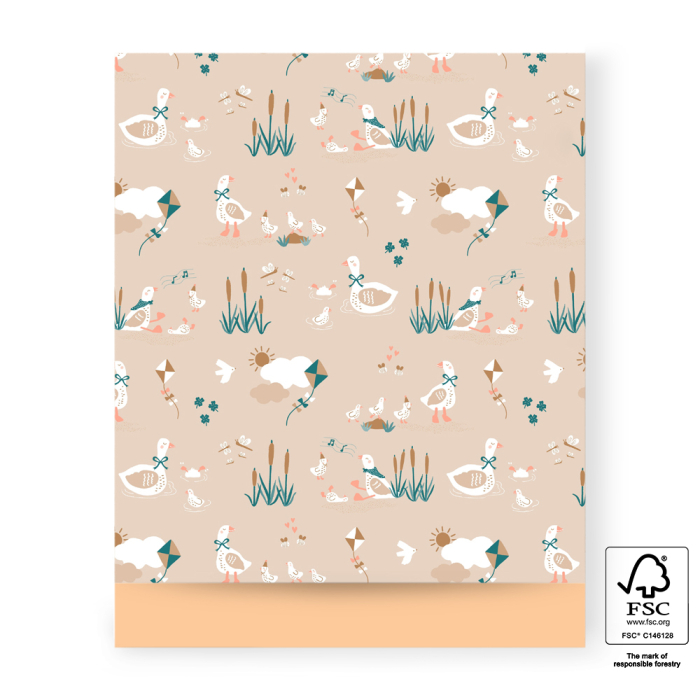 Verpak geboortecadeautjes stijlvol met de duurzame cadeauzakjes van House of Products. Dit prachtige baby ontwerp is een samenwerking met designer Joëlle Wehkamp. Het inpakpapier is bedrukt met een schattig dessin van gansjes, aangevuld met groene en oranje details op een nude kleurige ondergrond. De zachte perzikkleurige binnenzijde zorgt voor een luxe uitstraling. Gemaakt van ongestreken FSC®-gecertificeerd papier, zijn deze zakjes een milieubewuste keuze voor winkeliers en webshops die op zoek zijn naar unieke geboorteverpakkingen. De zakjes zijn plat en verkrijgbaar in diverse maten, perfect voor kleine tot middelgrote geschenken. Kies voor duurzaamheid en stijl met House of Products en maak elk cadeau onvergetelijk.