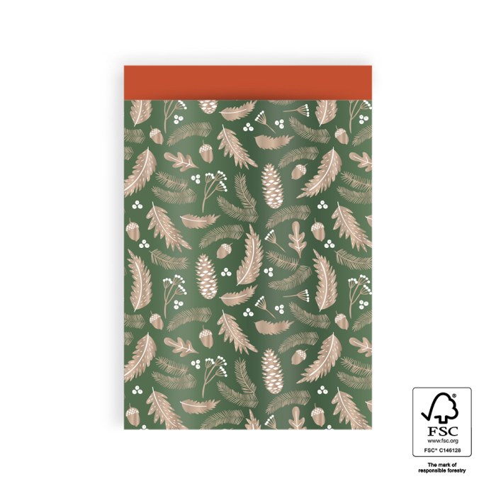 Deze platte cadeauzakjes met een groene metallic ondergrond en metallic beige dennenappels zorgen voor een stijlvolle en natuurlijke uitstraling. Het winterse natuurdesign is sfeervol en perfect voor de feestdagen, maar ook het hele jaar door geschikt. De binnenzijde heeft een warme cognackleur, wat het geheel een luxe touch geeft. Verkrijgbaar in diverse maten, zodat je altijd de juiste maat cadeauzak hebt voor jouw producten. House of Products levert duurzame, FSC®-gecertificeerde verpakkingen, ideaal voor winkeliers en webshops die kwaliteit en milieu hoog in het vaandel hebben staan.