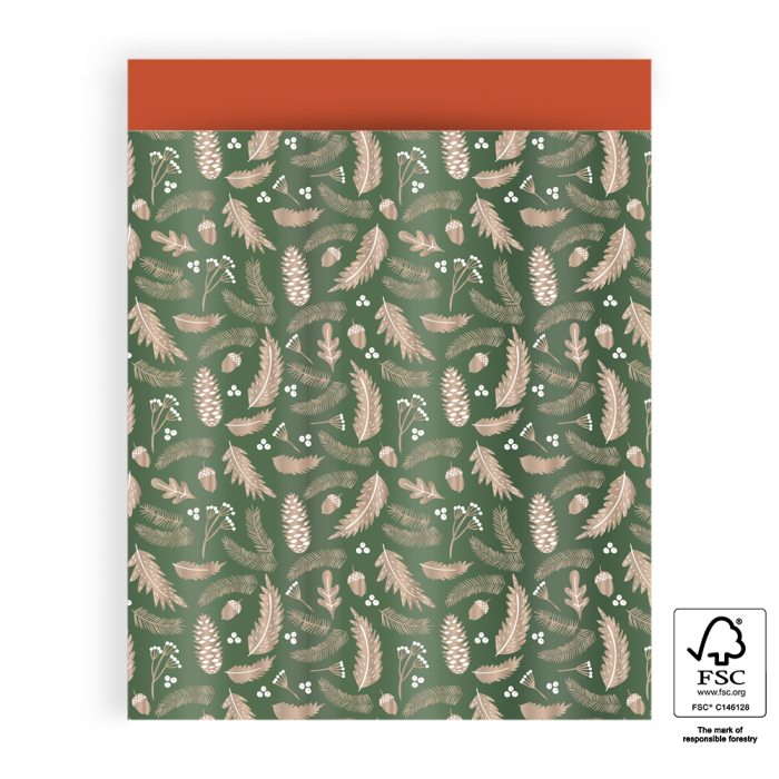Deze platte cadeauzakjes met een groene metallic ondergrond en metallic beige dennenappels zorgen voor een stijlvolle en natuurlijke uitstraling. Het winterse natuurdesign is sfeervol en perfect voor de feestdagen, maar ook het hele jaar door geschikt. De binnenzijde heeft een warme cognackleur, wat het geheel een luxe touch geeft. Verkrijgbaar in diverse maten, zodat je altijd de juiste maat cadeauzak hebt voor jouw producten. House of Products levert duurzame, FSC®-gecertificeerde verpakkingen, ideaal voor winkeliers en webshops die kwaliteit en milieu hoog in het vaandel hebben staan.