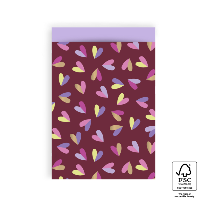 Ontdek de prachtige cadeauzakjes van House of Products, versierd met diverse hartjes in duo kleuren roze, paars, geel en goud op een biet rode ondergrond. Deze platte zakjes zijn verkrijgbaar in verschillende maten, perfect voor elke gelegenheid. De lila binnenzijde voegt een extra vleugje elegantie toe. House of Products is een duurzaam en FSC®-gecertificeerd bedrijf, wat betekent dat onze producten milieuvriendelijk zijn. Geef je geschenken een stijlvolle en verantwoorde verpakking met onze mooie cadeauzakjes. Ideaal voor winkeliers en webshops die op zoek zijn naar kwalitatieve verpakkingsoplossingen.