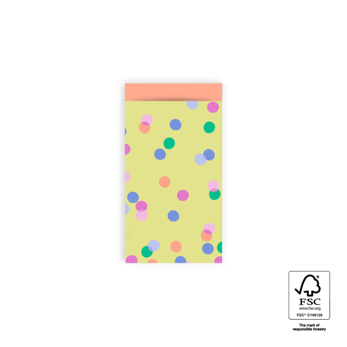 Met de platte cadeauzakjes van House of Products maak je inpakken snel en stijlvol. Deze zakjes, beschikbaar in diverse maten, zijn perfect voor iedere leeftijd en doelgroep. Het speelse dessin met kleine confettistippen in roze, oranje, groen en blauw op een lichtgele ondergrond geeft een feestelijke uitstraling. De zalmkleurige binnenzijde voegt een verrassend detail toe. Ideaal voor winkeliers die op zoek zijn naar duurzame en praktische verpakkingsoplossingen. Gemaakt van FSC®-gecertificeerd papier, zijn deze zakjes een milieuvriendelijke keuze zonder in te leveren op kwaliteit. Combineer met bijpassende stickers en linten voor een complete cadeau-ervaring.