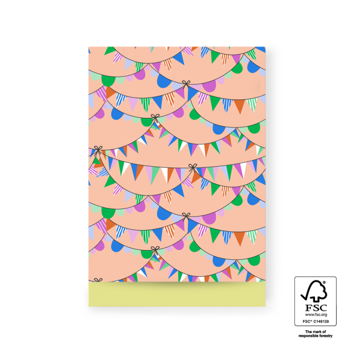 Deze platte cadeauzakjes zijn perfect voor verjaardagen en feestelijke gelegenheden. Het vrolijke dessin toont kleurrijke vlaggetjes in cognac, blauw, groen en roze op een oranje ondergrond. De binnenzijde is geel, wat zorgt voor een frisse uitstraling. Verkrijgbaar in diverse maten, zodat je altijd de juiste maat cadeauzakje hebt voor jouw producten. House of Products levert duurzame, FSC®-gecertificeerde inpakmaterialen, speciaal ontwikkeld voor winkeliers en webshops die kwaliteit en milieubewustzijn waarderen. Combineer deze zakjes eenvoudig met onze linten en stickers voor een feestelijke verpakking die indruk maakt.