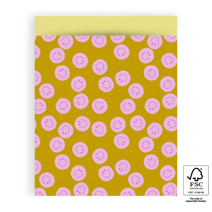 Deze platte cadeauzakjes met vrolijke smileys in lichtroze op een olijfgroene ondergrond maken elk cadeau feestelijk. Het dessin is geschikt voor alle leeftijden en zorgt voor een blij en vrolijk effect. De binnenzijde is lichtgeel, wat een warme uitstraling geeft. Verkrijgbaar in diverse maten, zodat je altijd de juiste zakjes hebt voor jouw cadeaus. House of Products levert duurzame, FSC®-gecertificeerde verpakkingen, perfect voor winkeliers en webshops. Combineer deze zakjes met onze stickers en linten voor een complete, milieuvriendelijke verpakking die jouw klanten zal verrassen.