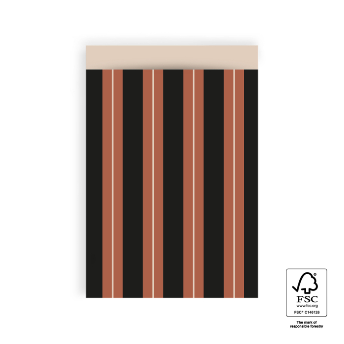 Deze platte cadeauzakjes met een subtiel en stijlvol streependessin zijn perfect voor elke gelegenheid. De dikke strepen zijn uitgevoerd in zwart en cognac, met een fijne beige detailstreep die het design elegant maakt. De binnenzijde is beige, wat zorgt voor een warme uitstraling. Verkrijgbaar in diverse maten en gemaakt van duurzaam, FSC®-gecertificeerd papier. Bij House of Products vind je deze hoogwaardige cadeauzakjes die ideaal zijn voor winkeliers en webshops die kwaliteit en milieuvriendelijkheid waarderen. Geef jouw cadeaus een stijlvolle en verfijnde verpakking met deze unieke zakjes.