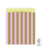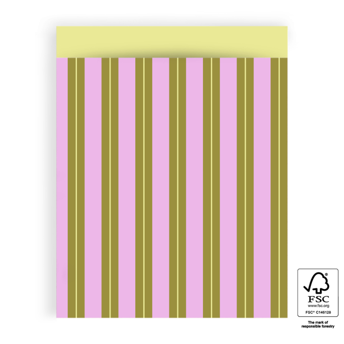 Deze platte cadeauzakjes hebben een vrolijk streeppatroon met dikke strepen in roze en olijfgroen, afgewerkt met een fijne gele detailstreep. De binnenzijde is lichtgeel, wat een frisse en warme uitstraling geeft. Verkrijgbaar in diverse maten, perfect om jouw cadeaus stijlvol en duurzaam te verpakken. Gemaakt van FSC®-gecertificeerd papier, passend bij het duurzame assortiment van House of Products. Ideaal voor winkeliers en webshops die kwaliteit en milieuvriendelijkheid belangrijk vinden. Combineer met onze bijpassende stickers en linten voor een compleet verpakkingspakket. Bestel snel en maak indruk met je verpakkingen!