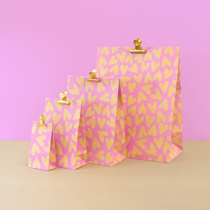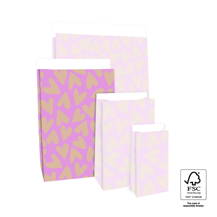 Voor iets grotere cadeaus kies je onze medium blokbodemzakken Big Hearts Pink/Nude. Makkelijk te sluiten met de 3 cm flap en geschikt voor diverse toepassingen. FSC® gecertificeerd materiaal.