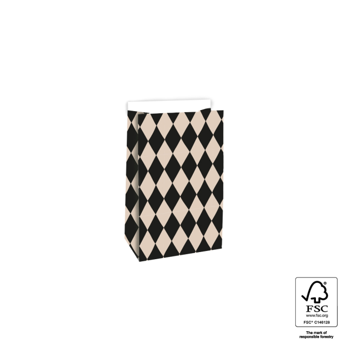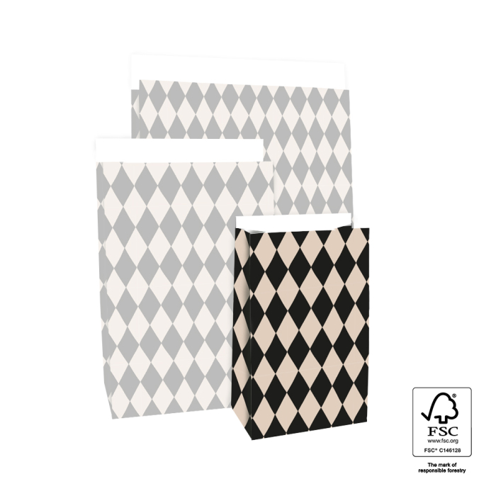Maak het inpakken feestelijk met Harlequin Neutral blokbodemzakken in small formaat. De 2 cm flap sluit makkelijk met sticker of paperclip. FSC® gecertificeerd.