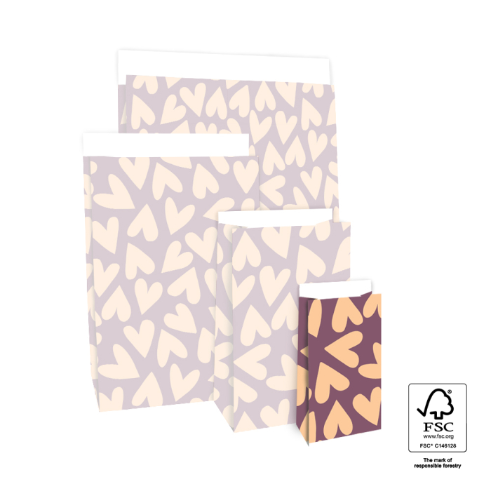 Pak je geschenken met liefde in met onze Hearts blokbodemzakken in bietenrood en perzik. Ideaal formaat voor kleine verrassingen. Deze blokbodemzakken zijn verkrijgbaar in 4 formaten en hebben allen een handige sluitflap. Sluit met een sticker of officeclip en sta versteld hoe snel en luxe je kunt inpakken met deze hoog kwaliteit en FSC® gecertificeerde blokbodemzakken. De klep van deze blokbodemzak is 2 cm.