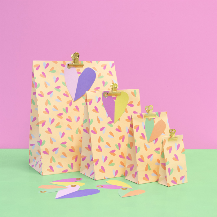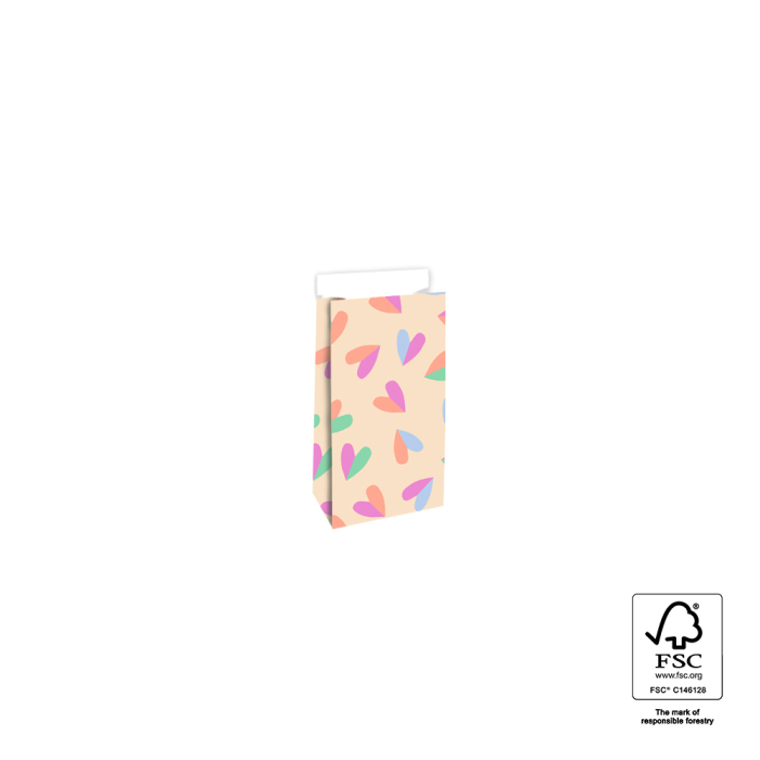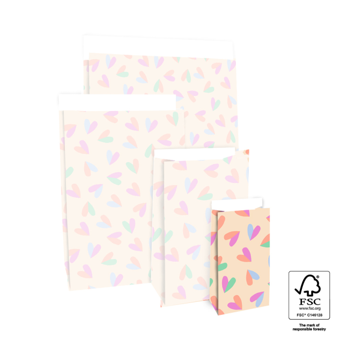 Maak een feest van het inpakken met onze blokbodemzakken - Hearts Duo Multi, extra small (7 x 4 x 13 cm). Deze compacte zakken zijn perfect voor het snel en eenvoudig inpakken van kleinere geschenken. Ze hebben een praktische sluitflap van 2 cm die je kunt sluiten met een sticker of officeclip. Gemaakt van FSC® gecertificeerd materiaal, bieden deze zakken zowel kwaliteit als duurzaamheid.