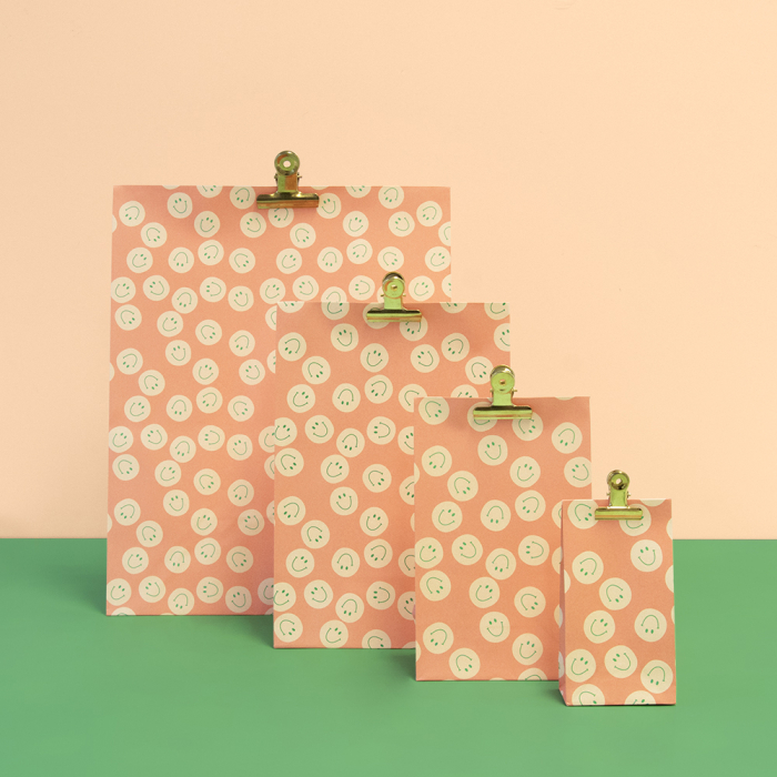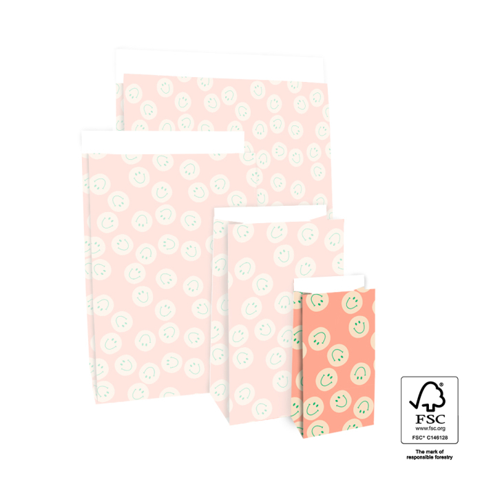 Maak een feest van het inpakken met onze blokbodemzakken - Smiley, extra small (7 x 4 x 13 cm). Deze vrolijke zakken zijn perfect voor het inpakken van kleinere geschenken. De sluitflap van 2 cm sluit eenvoudig met een sticker of officeclip. Gemaakt van FSC® gecertificeerd materiaal voor kwaliteit en duurzaamheid.