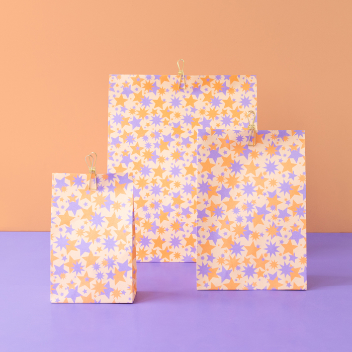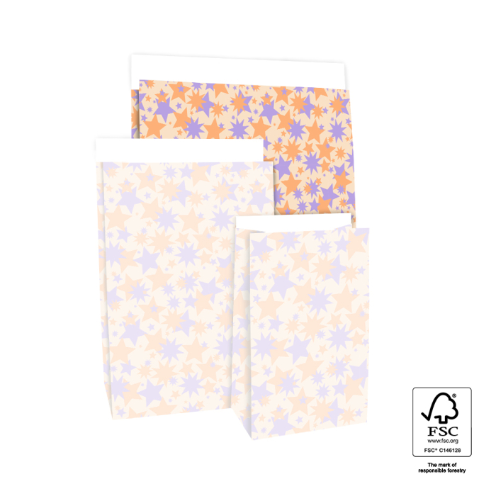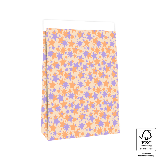 Maak een statement met onze Blokbodemzakken - Big Stars Lilac/Orange! Deze opvallende paarse en oranje sterren op een peach achtergrond geven je verpakkingen een moderne en levendige uitstraling. Kies uit 3 formaten van deze hoogwaardige, FSC®-gecertificeerde zakken om je producten te presenteren met stijl en duurzaamheid. Sluit met een sticker of officeclip en sta versteld hoe snel en luxe je kunt inpakken met deze hoog kwaliteit en FSC® gecertificeerde blokbodemzakken. De klep van deze blokbodemzak is 4 cm.