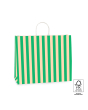 Stevige bedrukte FSC® gecertificeerde papieren tassen met twist-cord. Bedrukt met een brede streep in groen en peach. De tassen zijn leverbaar in 4 formaten, deze de grootste is. Maak deze universele en duurzame draagtassen persoonlijk met een sticker op de tas of cadeaulabel aan het handvat.