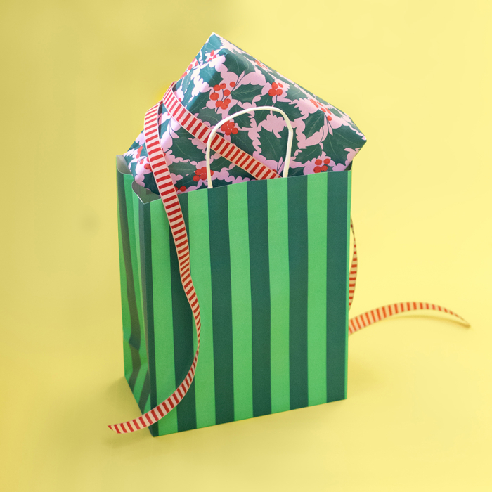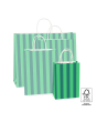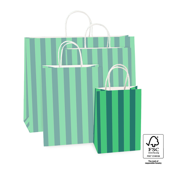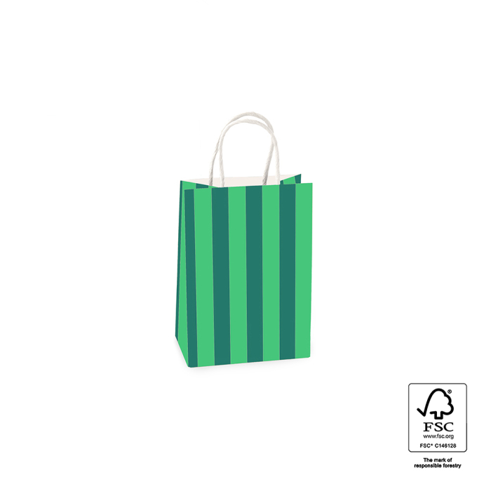 Een stijlvolle papieren tas in klein-formaat, perfect voor kleine aankopen zoals sieraden, accessoires of cadeaubonnen. Het Jade Green streeppatroon straalt klasse uit en past bij het winter seizoen. De tas is gemaakt van stevig FSC® gecertificeerd papier, zodat je niet alleen mooi maar ook verantwoord verpakt. Combineer met een bijpassende sticker of vloeipapier voor een luxe finishing touch. Perfect voor bij de toonbank of als cadeautasje.