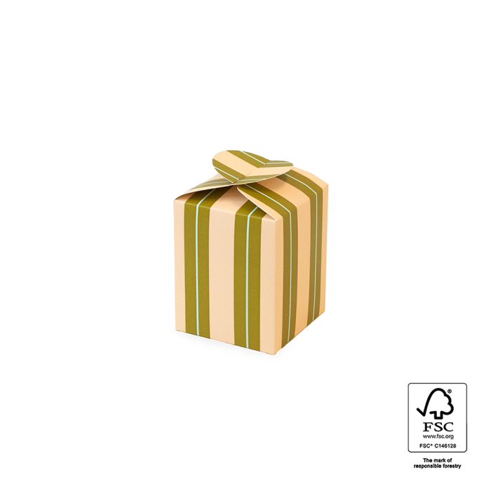 Deze kleine geschenkdoos heeft een stijlvolle strependecoratie in peach en olijfgroen, met een subtiel mintgroen detail. FSC® gecertificeerd en verpakt per 30 stuks. Perfect voor het duurzaam verpakken van kleine cadeaus in jouw winkel of webshop. Geef je geschenken een frisse en moderne uitstraling met deze doos van House of Products.