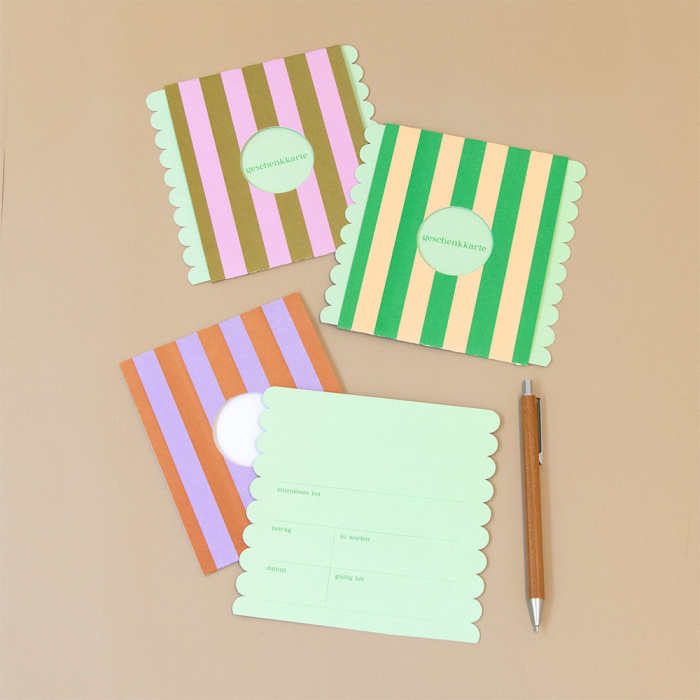 Een set van 15 geschenkkaarten met een stijlvol gestreept ontwerp en een Duitstalige boodschap. Deze gift cards zijn ideaal voor winkels en webshops met Duitse klanten. De kaarten zijn voorzien van een kleurrijk ontwerp, een geschulpte rand en gemaakt van stevig FSC®-gecertificeerd papier. Ze geven je cadeaubonnen een speelse maar toch luxe uitstraling bij het meegeven of opsturen.