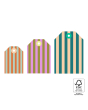 Met deze set cadeaulabels in drie formaten (S-M-L) geef je elk cadeau een stijlvolle finishing touch. Het gestreepte design past perfect bij elk type inpakpapier en maakt jouw verpakking extra feestelijk. Ideaal voor winkels en webshops die graag variëren in grootte en uitstraling. De labels zijn gedrukt op FSC® gecertificeerd papier, dus je kiest ook voor duurzaamheid. Combineer ze met bijpassend lint of stickers uit het House of Products assortiment voor een compleet geheel. Een must-have voor ieder inpakstation!