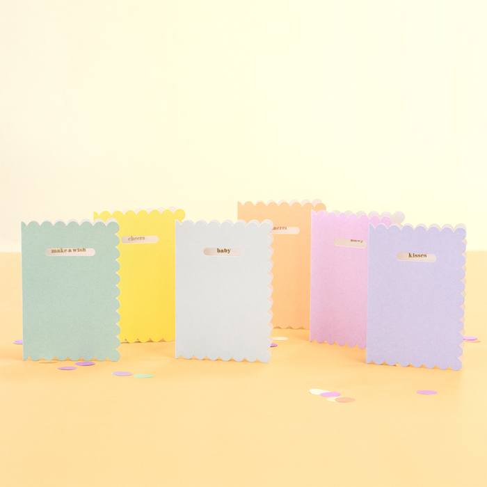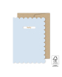 Deze FSC® gecertificeerde wenskaart heeft een zachte lichtblauwe kleur en een speelse kartelrand. Het venster toont de tekst Baby, die binnenin met goudfolie is gedrukt. Inclusief bruine kraft envelop. Verpakt per 6 stuks, ideaal voor jouw winkel of webshop.
