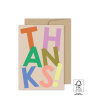Deze FSC® gecertificeerde wenskaart heeft een beige achtergrond met het woord "Thanks!" in grote, feestelijke letters in diverse kleuren. Inclusief bruine kraft envelop. Verpakt per 6 stuks, ideaal voor jouw winkel of webshop.
