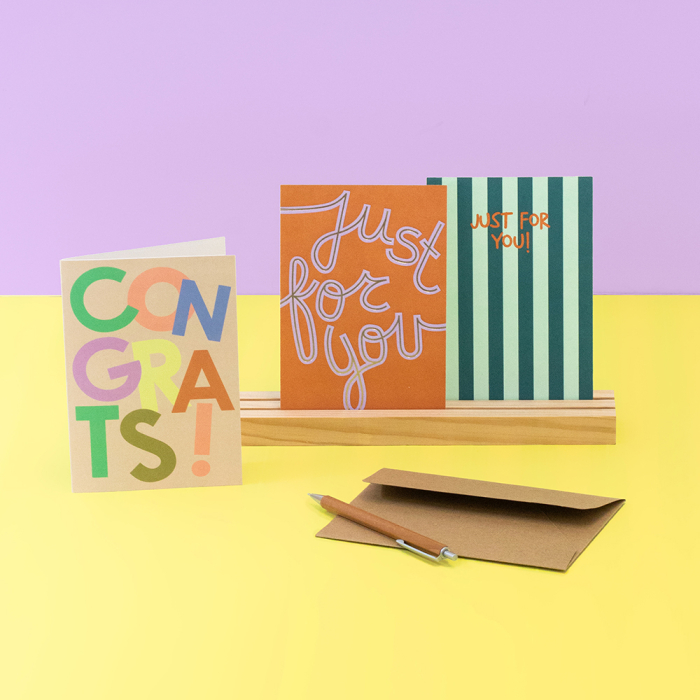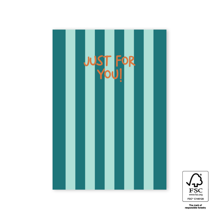 Deze stijlvolle ansichtkaart met groene strepen en de tekst 'Just for you!' is perfect voor elke gelegenheid. FSC® gecertificeerd en verpakt per 6 stuks. Een duurzame en persoonlijke toevoeging bij jouw cadeaus of bestellingen. Maak je verpakking compleet met deze kaart die jouw boodschap mooi overbrengt.