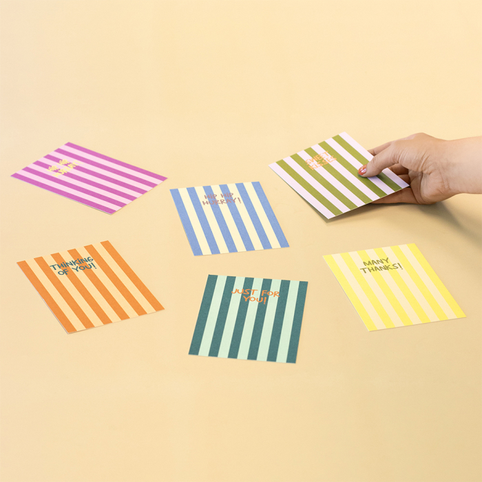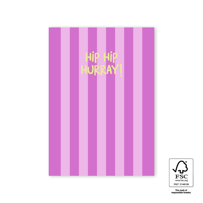 Deze vrolijke ansichtkaart met roze strepen en de tekst ‘Hip hip hurray!’ is ideaal voor elke feestelijke gelegenheid. FSC® gecertificeerd en per 6 verpakt. Perfect om jouw cadeaus of bestellingen een persoonlijke en duurzame touch te geven. Maak je pakket compleet met deze stijlvolle kaart!