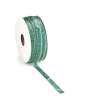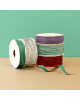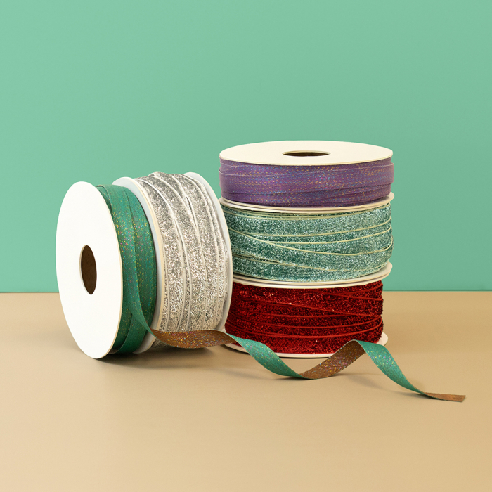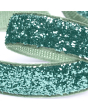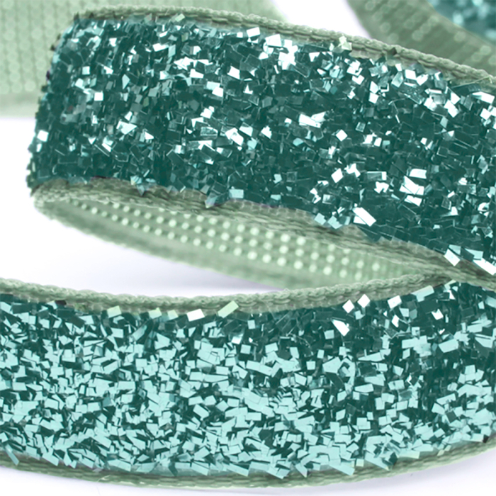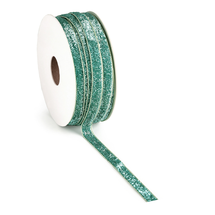 Een feestelijk stoffen lint in de kleur groen met mint groene glitters. Perfect om cadeaus stijlvol mee te versieren. 9 mm breed en 15 meter lang.