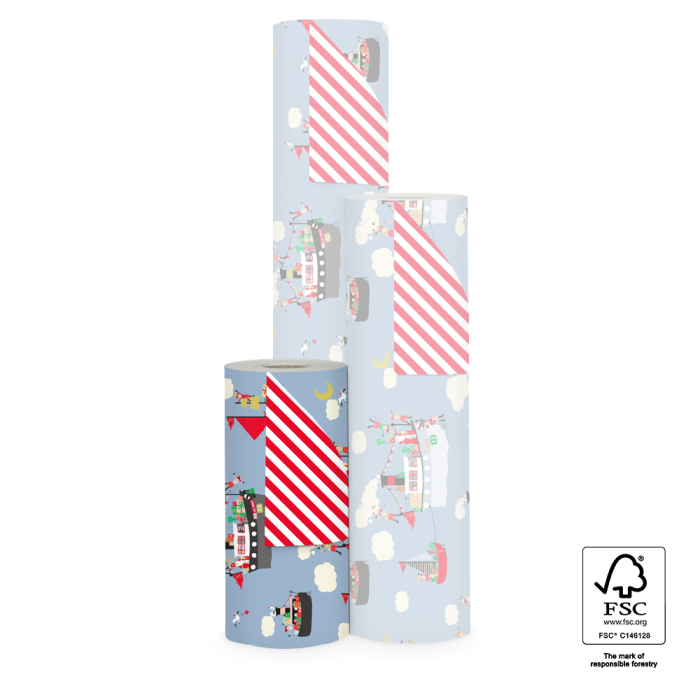 Vier het Sinterklaasfeest met dit vrolijke inpakpapier van House of Products! De toonbankrol van 150 meter toont de iconische stoomboot vol pakjes op een lichtblauwe achtergrond. De speelse illustraties in geel, groen en rood zorgen voor een feestelijk geheel. De achterzijde heeft een rood gestreept patroon — perfect voor verrassende combinaties bij het inpakken. Gedrukt op duurzaam FSC®-gecertificeerd papier, dus goed voor het milieu én je winkelpresentatie. Combineer met lint en stickers uit dezelfde lijn en maak van elk cadeau een feestelijk moment. Ideaal voor speelgoedwinkels, boekhandels en cadeauzaken.