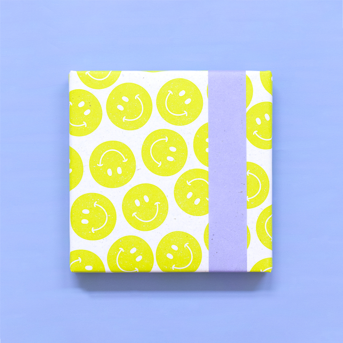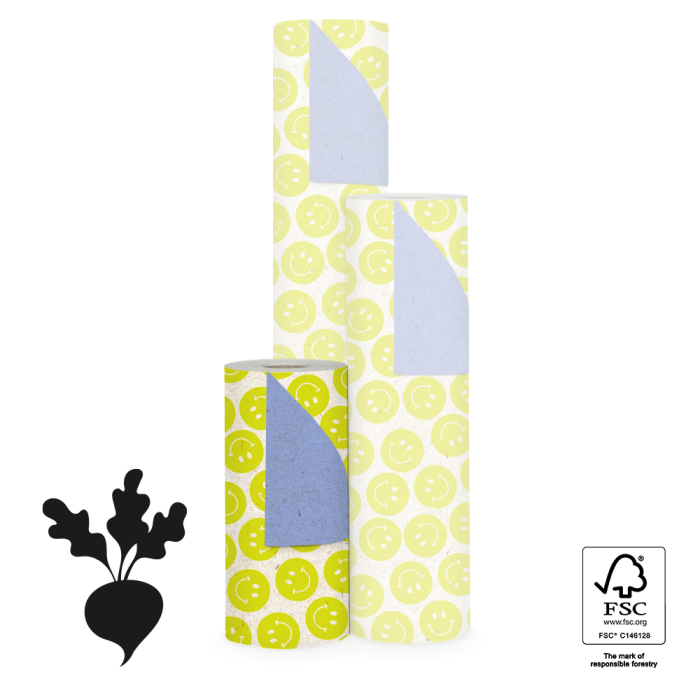 Ontdek het plezier van inpakken met onze toonbankrol inpakpapier van House of Products! Het opvallende dessin met gele smileys brengt vreugde in het inpakproces. Dit papier heeft een achterzijde in de kleur blauw. Met 150 meter aan vrolijkheid is deze rol perfect voor jouw winkel. Maak van elke verpakking een feestje! Gedrukt op suikerbietenpapier, maken we duurzaamheid een prioriteit.