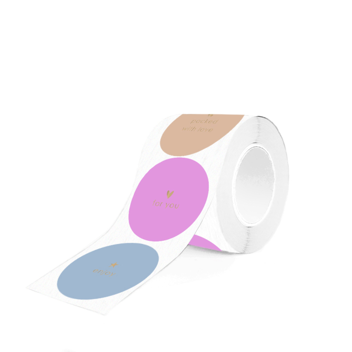 Geef je cadeauverpakking een persoonlijke én luxe uitstraling met deze Text Gold stickers. Op één FSC® gecertificeerde rol vind je 250 ronde stickers (Ø 55 mm) in drie stijlvolle kleuren: blauw, roze en beige. Elke sticker bevat een unieke quote in sierlijke goudfolie - ideaal om jouw verpakking net dat beetje extra te geven. Perfect voor winkels en webshops die op zoek zijn naar originele én duurzame verpakkingsoplossingen. Gebruik ze op cadeauzakjes, dozen of enveloppen, en combineer met inpakpapier of lint van House of Products voor een complete presentatie.