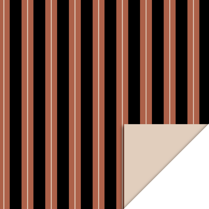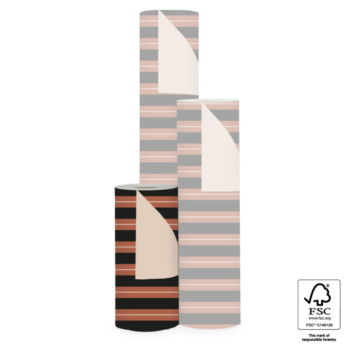 Geef cadeautjes een stijlvolle uitstraling met dit luxe inpakpapier van House of Products. De toonbankrol van 150 meter is bedrukt met brede strepen in zwart en cognac, afgewisseld met een subtiele beige lijn. De achterzijde is effen beige, wat zorgt voor een verfijnde afwerking. Perfect voor modewinkels, conceptstores en cadeauwinkels die waarde hechten aan uitstraling én duurzaamheid. Dit FSC®-gecertificeerde papier is ideaal voor dagelijks gebruik en laat zich goed combineren met onze linten en stickers. Verpak je producten met aandacht — duurzaam, stijlvol en professioneel.