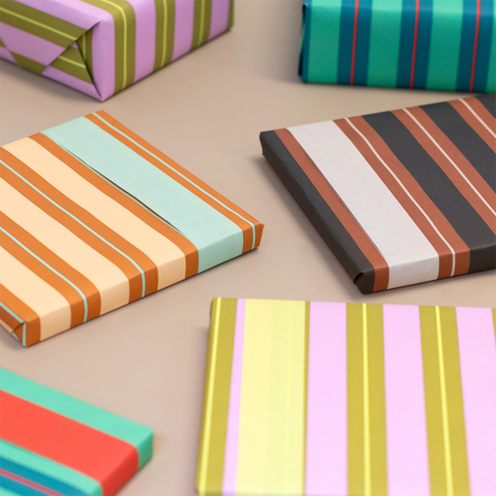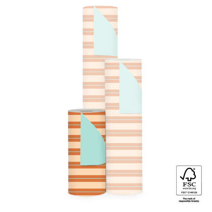 Breng kleur op je toonbank met deze vrolijke toonbankrol van 150 meter inpakpapier. Het dessin bestaat uit brede strepen in peach en cognac met een fijne pistachekleurige lijn als detail. De pistachegroene achterzijde zorgt voor een verrassende twist bij het inpakken. Gemaakt van FSC®-gecertificeerd papier, dus een duurzame keuze voor jouw winkel of webshop. Combineer dit dessin met bijpassende linten of stickers voor een complete cadeauverpakking. Ideaal voor elke gelegenheid, van verjaardagen tot feestdagen. House of Products is dé specialist in duurzaam en stijlvol inpakpapier voor winkeliers.