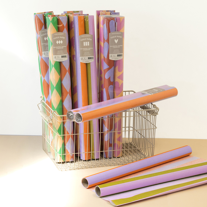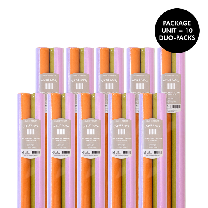 Met dit artikel kun je vloeipapier ook als consumentenartikel aanbieden in je winkel of webshop. In het duo pack zitten 2 rollen met leuke gestreepte print, in paars/cognac en roze/olive. De rollen hebben ieder een lengte van 50 cm x 5 meter. Genoeg voor het inpakken van vele geschenktasjes, het beschermen van breekbare producten of het feestelijk inpakken van kleding. Ideaal voor thuis!