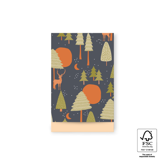 Geef je cadeaus een natuurlijke en stijlvolle verpakking met deze cadeauzakjes van House of Products. De platte zakjes zijn verkrijgbaar in diverse maten en bedrukt met een sfeervol dessin van bomen en herten in donkerblauw, cognac en olijfgroen. De zachte peach kleur aan de binnenzijde geeft een warme uitstraling. Gemaakt van duurzaam, FSC®-gecertificeerd papier, zijn deze zakjes perfect voor winkeliers en webshops die kiezen voor milieuvriendelijke verpakkingen. Met deze cadeauzakjes presenteer je jouw producten op een stijlvolle en milieubewuste manier.