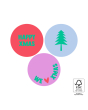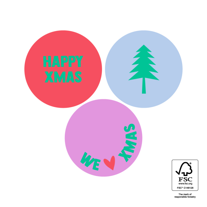 Vier de feestdagen met deze vrolijke X-mas Stickers Multi - Happy Colours. De rol bevat 250 stickers van 35 mm met drie verschillende designs in de frisse kleuren rood, groen, blauw en roze. Perfect om cadeaus, enveloppen en kerstverpakkingen een trendy en feestelijke uitstraling te geven. Het product is volledig FSC® gecertificeerd, dus je kiest voor een duurzame én kleurrijke finishing touch. Ideaal voor winkels en webshops die hun kerstverpakkingen net dat beetje extra willen geven.